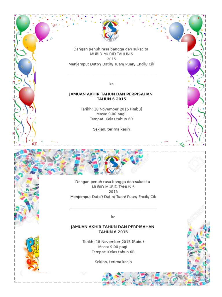 Pusat sumber sekolah. Contoh kad jemputan jamuan akhir tahun kelas Web Contoh Kerja Kursus Pengajian Am Tingkatan 6 Penggal 2 2015 STPM Majlis Perkahwinan Masyarakat India. Save save kad jemputan jamuan akhir tahun for later.